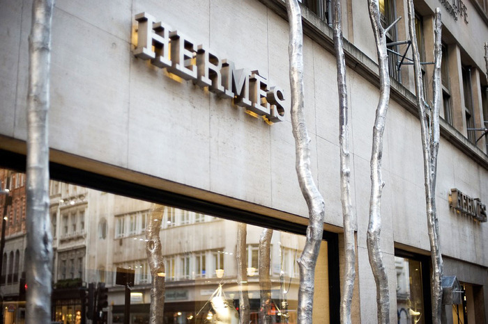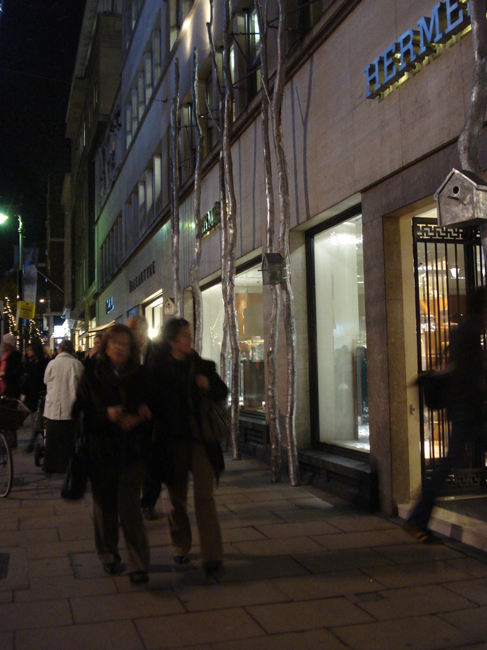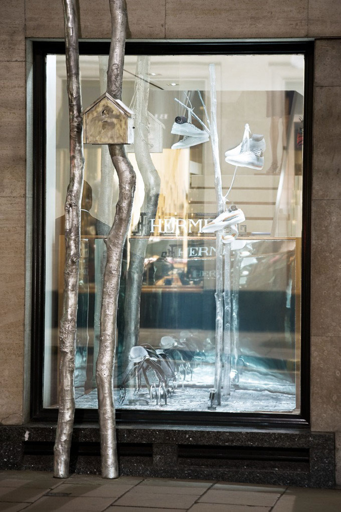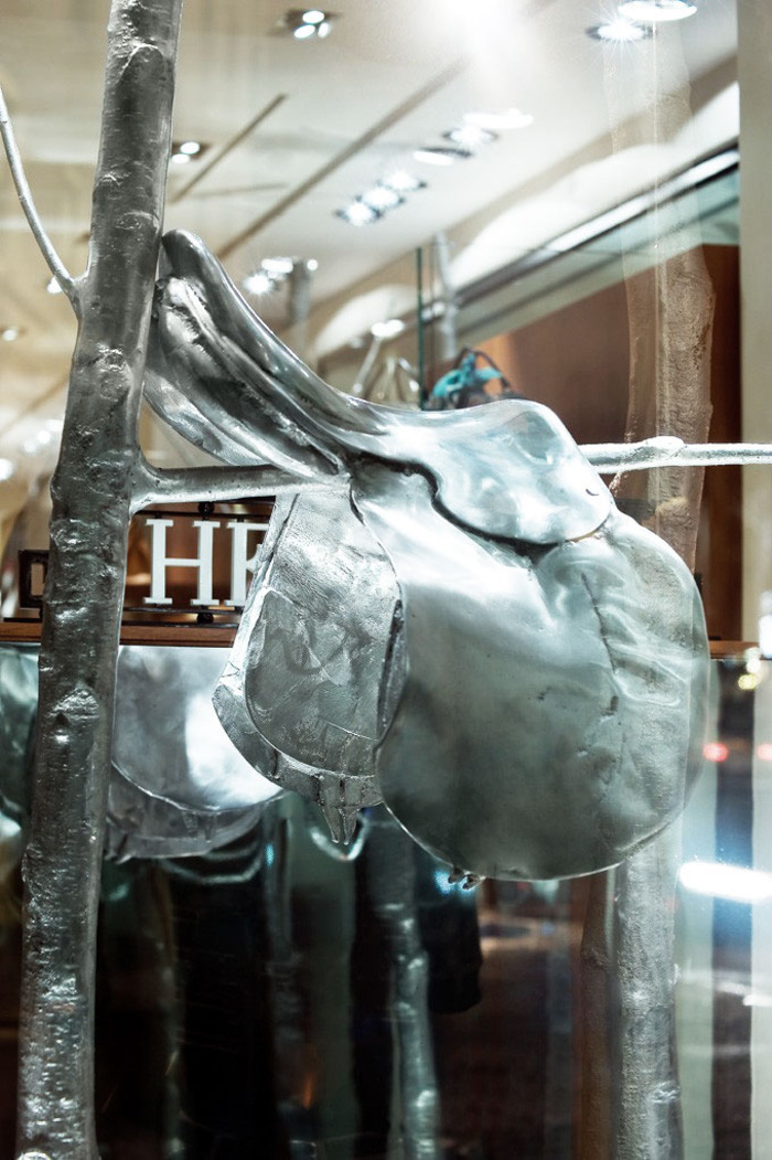 Eighteen of the shimmering cast silver trees were installed into the pavements of New Bond Street and Bruton Street, the axis of the Hermès boutique. The forest continues into the windows and through-out the ground floor of the store. Passers-by are able to explore the iridescent forest, to touch the wintry surface of the metal and feel the ‘bark’ etched with the patina of the silver birch...in the background the sound of birds and horses’ hooves galloping in the winter snow can be heard.