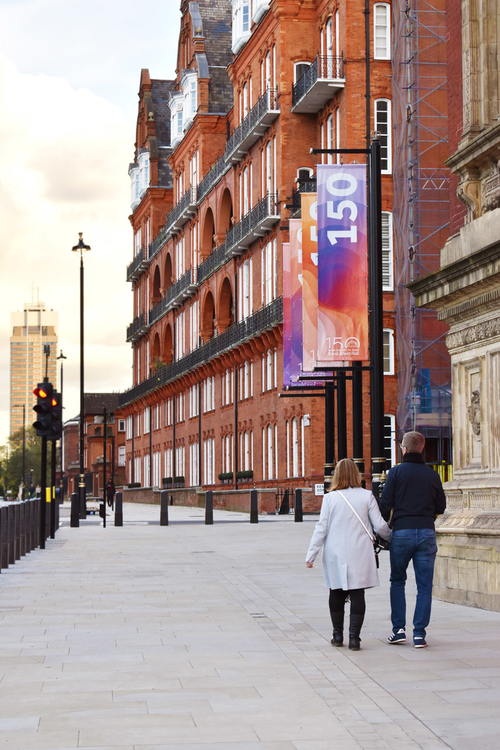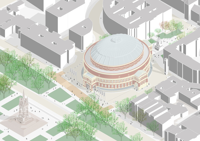 The Royal Albert Hall is one of UK’s most beloved and visited buildings, and the busiest venue in the world, with 400 performances in the auditorium and over 1000 events beyond the main stage every year. Whilst it hosts the most extraordinary events and performances, from the Proms to red carpet premieres, the building itself had become an island marooned in a sea of tarmac, with a busy carriageway separating it from its namesake monument, the Albert Memorial, and London’s most important open green space, Hyde Park. These existing conditions did not offer the dignity nor the accessibility that artists, audiences, tourists and even local residents expect of such an internationally renowned venue.