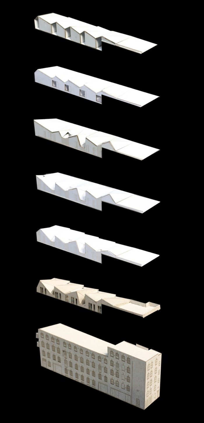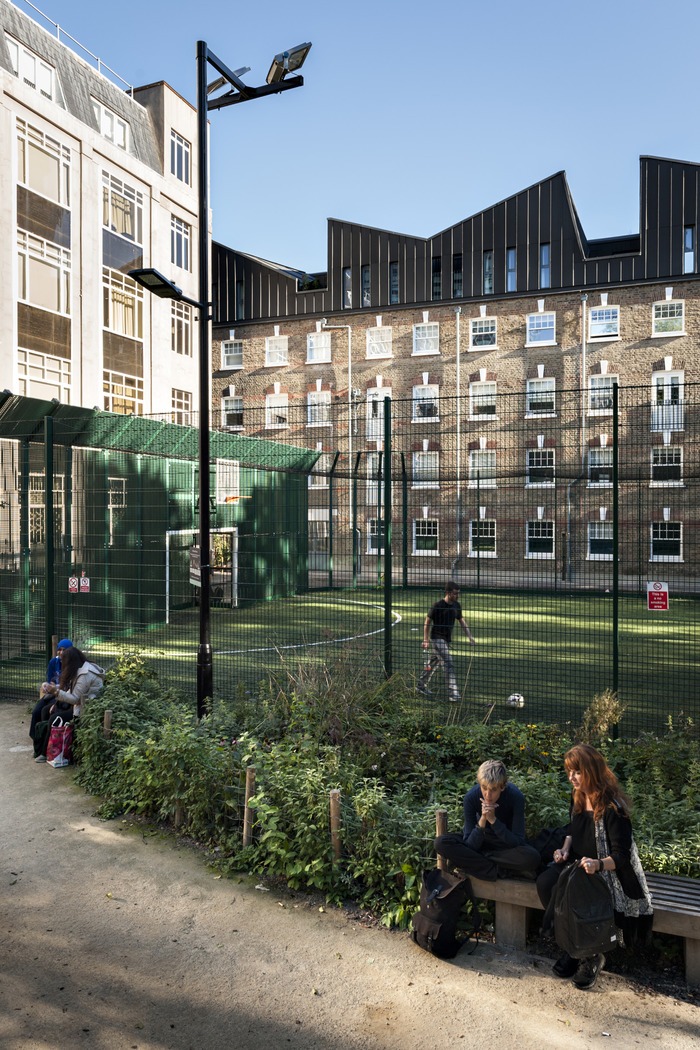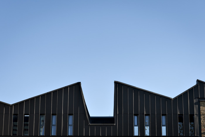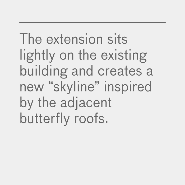 The extension sits lightly on the existing building and creates a new “skyline” inspired by the adjacent butterfly roofs to crown a building that appeared somewhat incomplete and contributed little to Whitfield Place. This roofscape is carved to create terraces which overlook the public space and to allow views of the sky from below. The proportions, scale, and materiality of the new element are carefully controlled to create a counterpoint to the existing building.