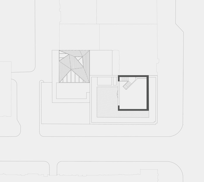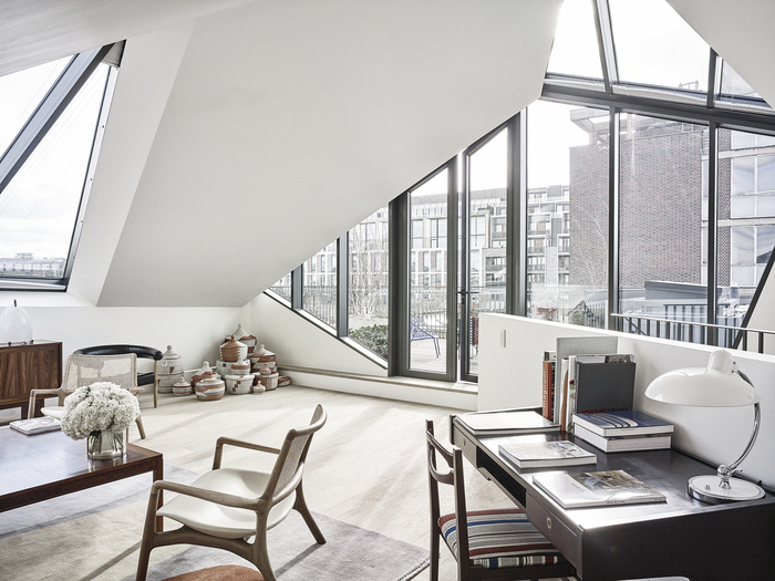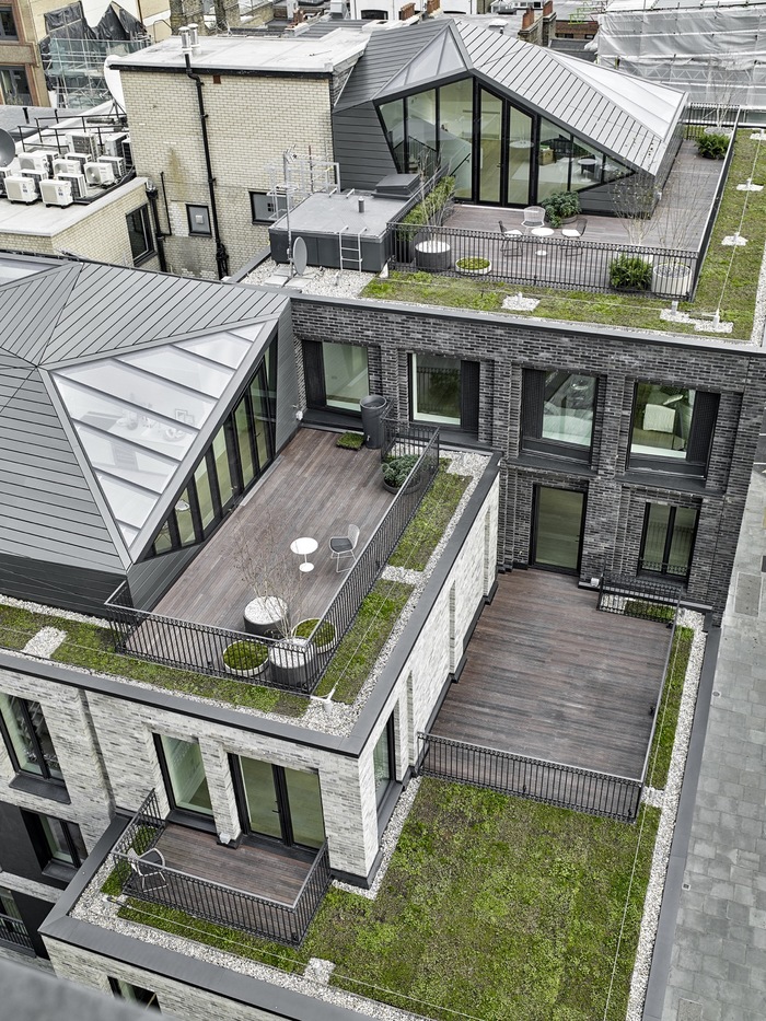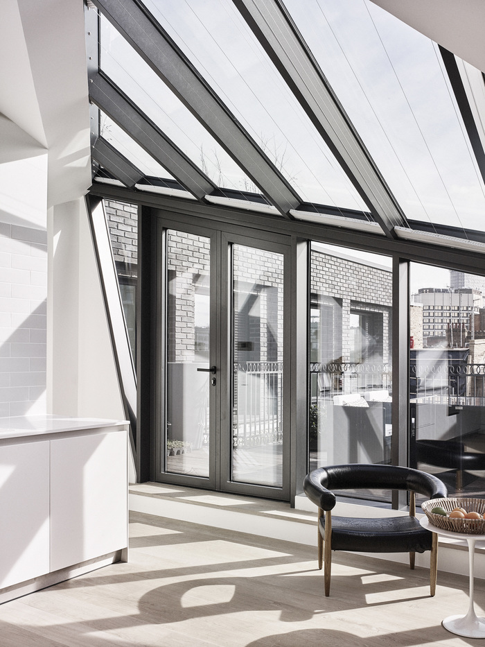 The pavilions on the roof offer a hidden terrain to the project that only becomes apparent upon enquiry, occupying as they do the Rights Of Light envelope established by neighbouring buildings. Corner House does not disrupt the consistent morphology of the solid brick facades that characterise the neighbourhood – however the shifting planes of its slightly angled windows to the top floor suggest something unexpected.