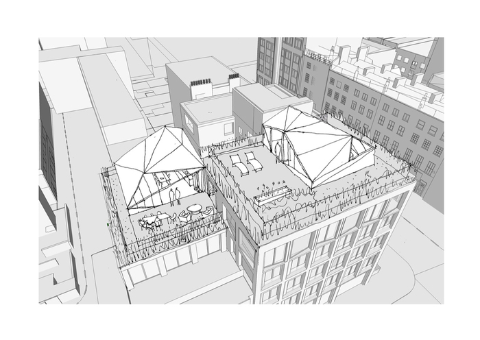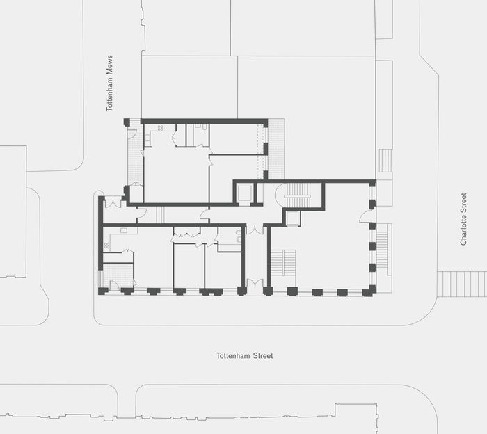 The entrances to Corner House are configured to respond to the local context. The commercial unit addresses the other commercial frontages on Charlotte Street and deals with the noisy thoroughfare whereas the proposed residential entrances fronts onto the quieter Tottenham Street and Mews.