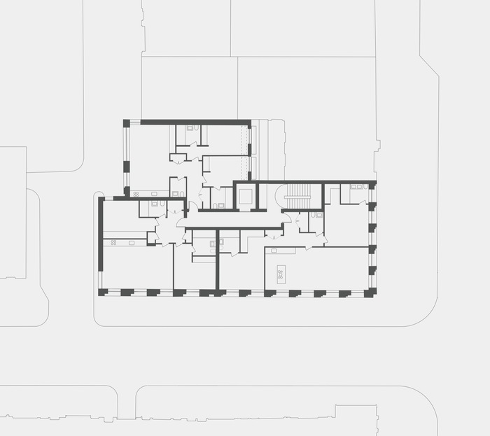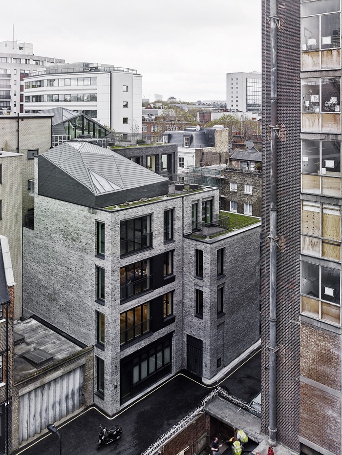 Long before DSDHA’s intervention there were three distinct buildings on this site which were subsequently replaced by a large modern scheme. Corner House attempts to bring back the character of the original structures, consolidating their identities into a single block that reflects the urban hierarchy of the surrounding streets – grander Charlotte Street, quieter Tottenham Street and the more utilitarian identity of Tottenham Mews.