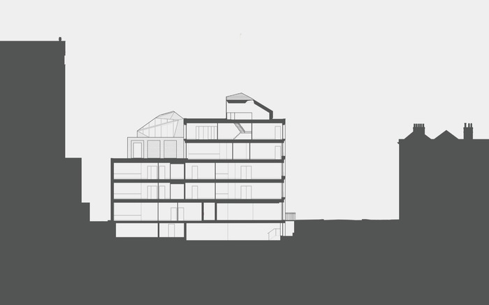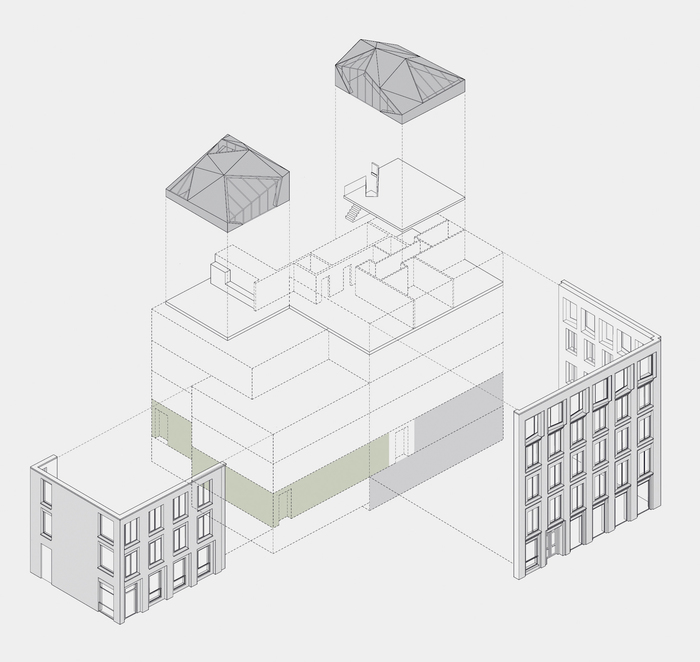 While at an urban level it celebrates the ordinary street corner, Corner House inverts this typology (typically presenting a more articulated treatment of the façade at the ground level) and places two jewel-like crystalline pavilions on the rooftop, opening up a series of unexpected views onto London’s variegated and ever changing roofscape.