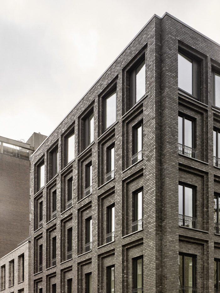 By using a traditional handset and load bearing approach the façade becomes ‘monolithic'. To mitigate the risk of cracking some movement joints are necessary – especially given the overall dimensions of the elevations. However, by using lime mortar instead of cement, and not supporting the brickwork from the structure, these joints have been dramatically reduced which contributes to the refined massing of the building which is at once both monumental and delicate.