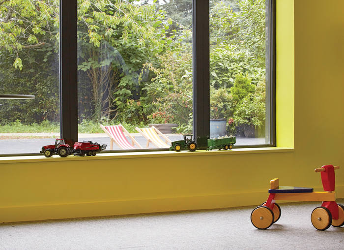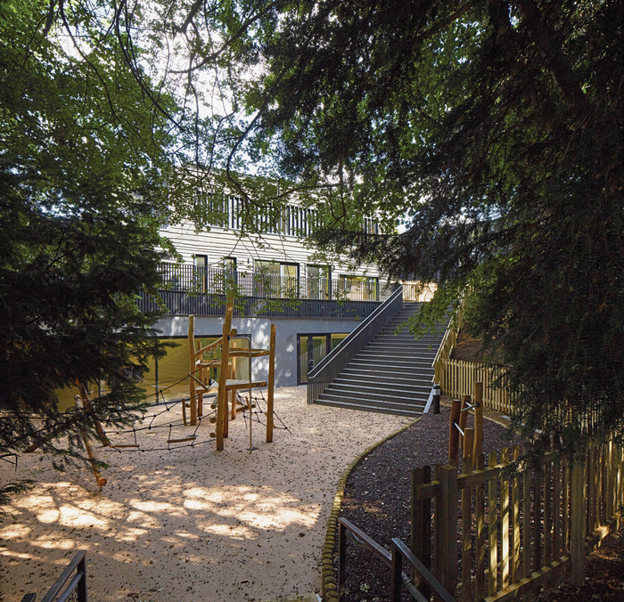 Our intervention – with its unusual black ‘waney’ edged timber cladding and neutral timber-lined interiors – allows the sense of the architecture to recede, shifting the focus to the children’s pedagogical activities and their connection to the mature landscape outside. This process of ‘visual editing’ applied to the building and the landscape aims at stimulating the children to establish a stronger and intimate relationship with nature, something increasingly at risk of being lost in our technologically saturated lives.