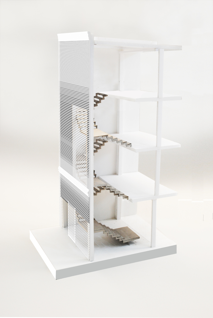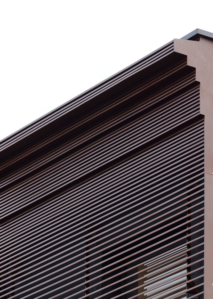 The façade’s horizontal metal blades establish a rhythmic harmony with the composition and articulation of the immediate streetscape, whilst achieving a moiré-like visual effect. This veiled appearance acts as a protective shield, allowing passers-by at ground level to catch a few glimpses of the activities inside. It is an architecture in conversation with its context, and also with the people who inhabit the area.