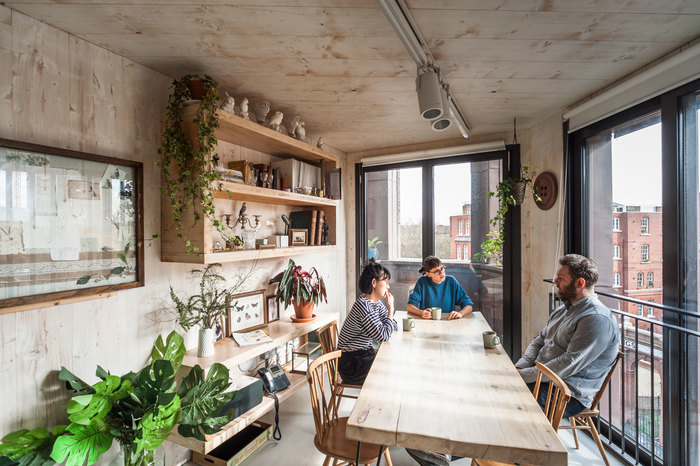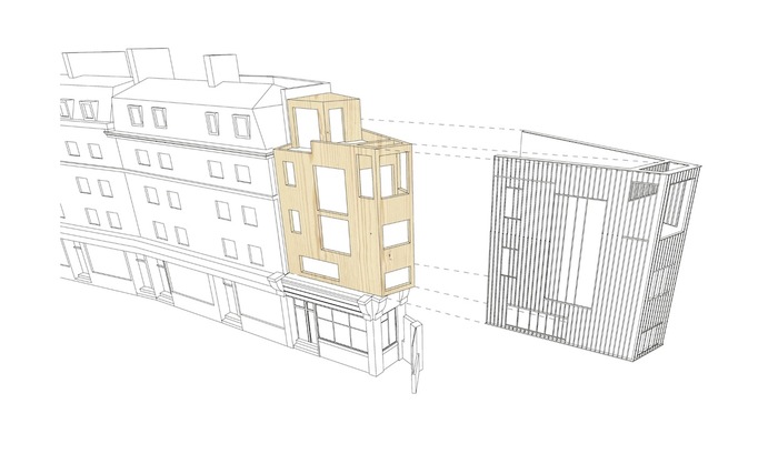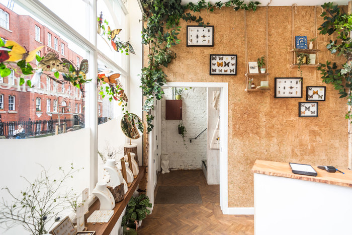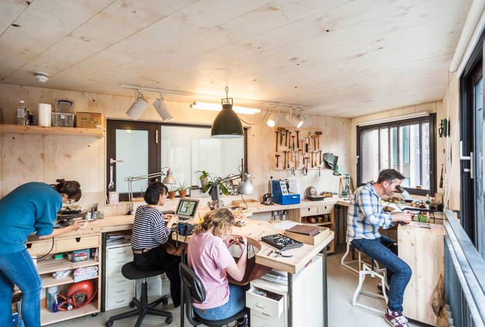 Alex Monroe’s new jewellery studio is within a stone’s throw of The Shard in the Bermondsey Conservation Area. The building is a handcrafted addition to an existing Edwardian single storey shop-front. The horizontal details of the precious handmade zinc facade subtly relate to the proportions of the neighbouring terraces, while the grey bronze tonality picks up on the surrounding buildings and their diverse shades and colours. The building is structurally constructed entirely from prefabricated cross laminated timber panels that are left exposed on the inside, the use of which has removed 27.1 tonnes of CO2 from the atmosphere.
