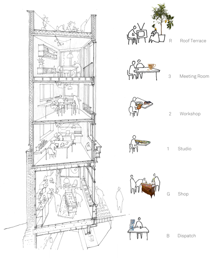 The building provides workshop and studio space, alongside a boutique store, a meeting space and a roof terrace. Large sliding doors in the workshop allow for generous engagement with the street, providing a place to extend one’s view as a counterpoint to the intimate work on the jewellery bench, whilst the third floor balcony extends the outdoor into the interior.