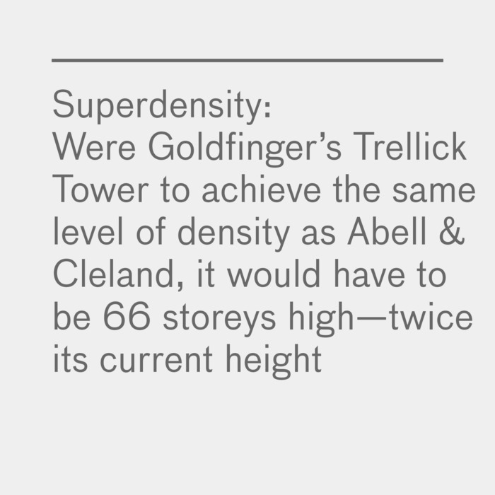 Moreover, with its exceptional density score of 319 dwellings per hectare, Abell & Cleland provides a model for the sustainable densification of the city. In terms of site usage, the scheme is 2.1 times more dense than Erno Goldfinger’s seminal Trellick Tower, built in north Kensington in 1972. Furthermore, were Trellick Tower to achieve the same level of density as Abell and Cleland, it would need to be 66 storeys high, well over twice its current height.