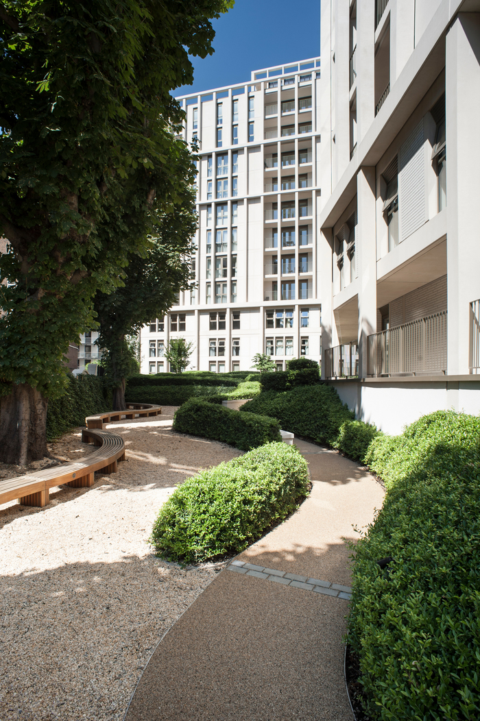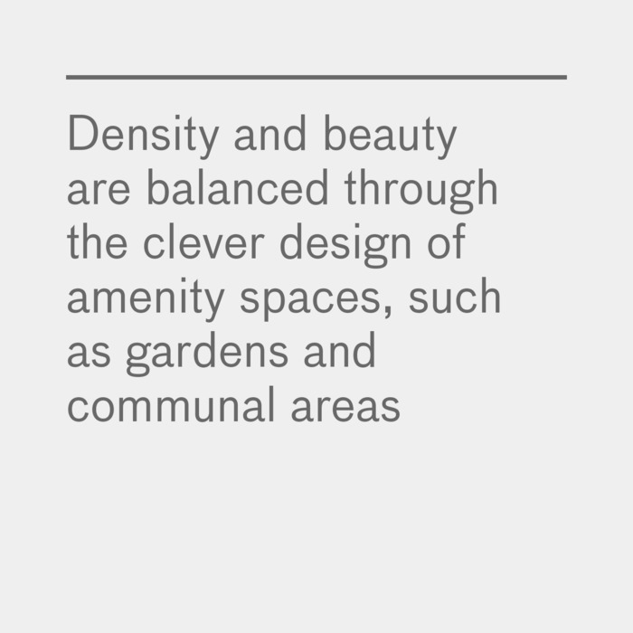 Amenity space such as gardens and communal areas are often thought to be one of the elements sacrificed to deliver high density, but here, by cleverly deploying the courtyard model in conjunction with the gardens and generous lobbies, we successfully balanced density with beauty and delight, delivering a substantial number of double-aspect flats and avoiding oppressive perimeter walls. All the elements that modernist slab housing usually failed to achieve. The exoskeleton that encases the buildings also allowed the insertion of terraces and balconies between the two skins of the facade, extending the pattern of private and shared amenity vertically as well as horizontally.