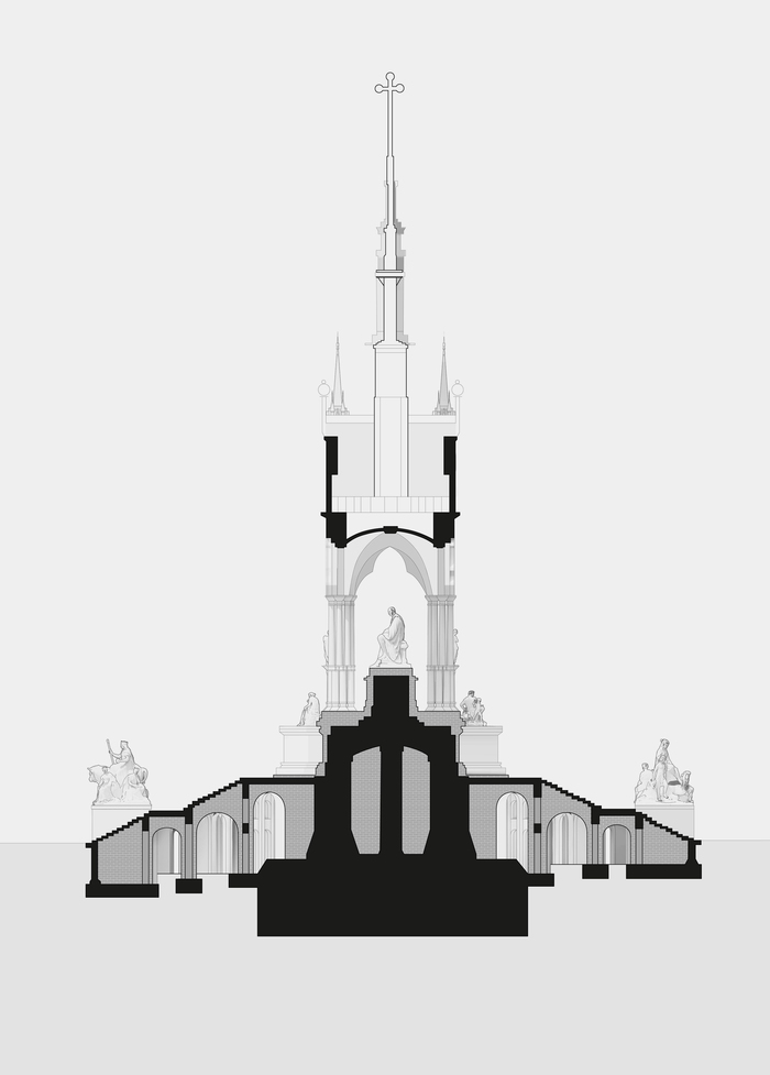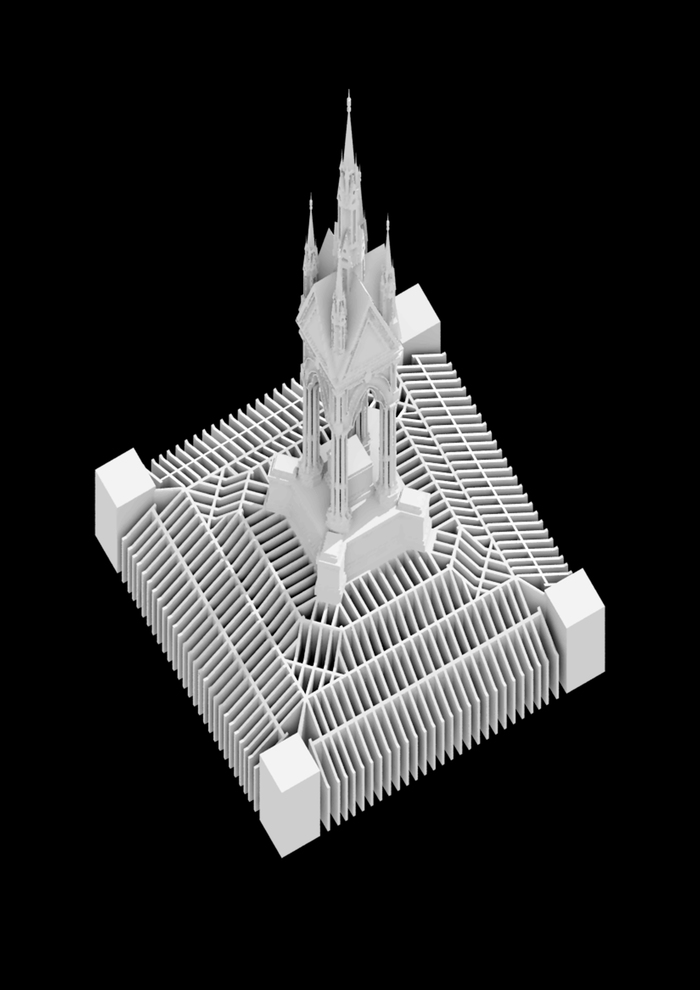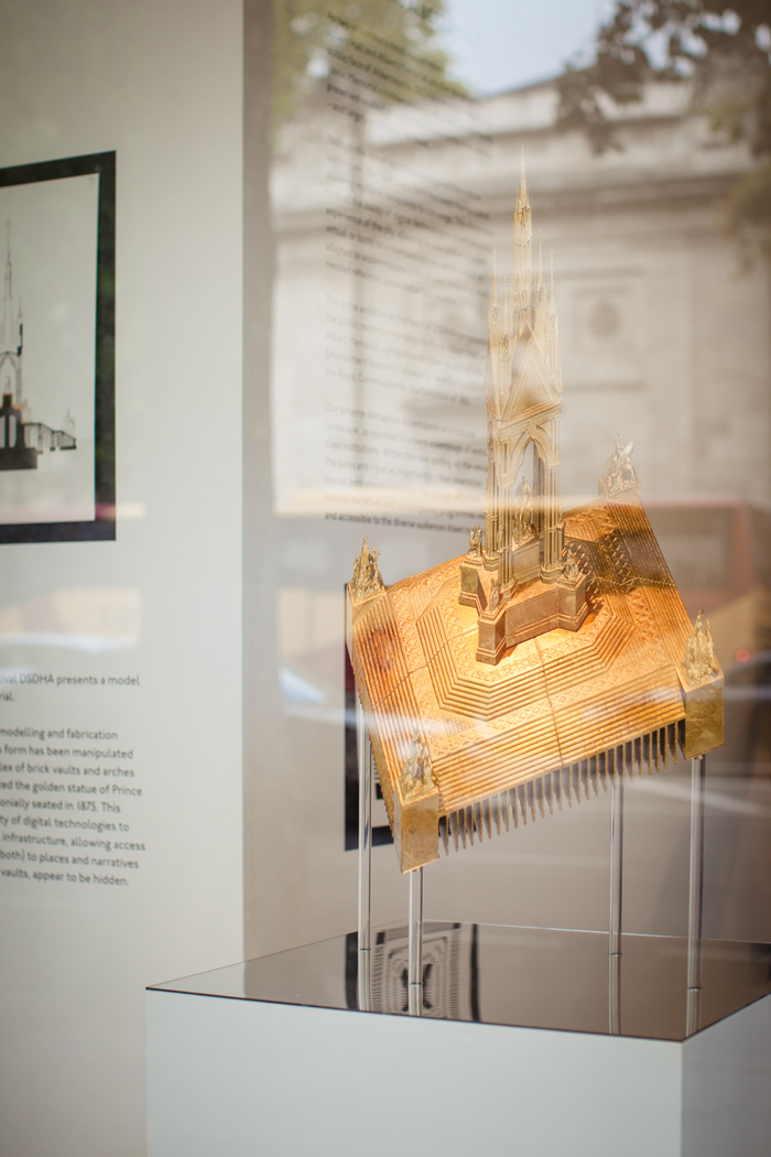 Through the use of digital modelling and fabrication techniques, DSDHA’s has has manipulated the model of the Memorial to reveal the hidden complex of brick vaults and arches that have dutifully supported the golden statue of Prince Albert since it was ceremonially seated in 1875. By allowing multiple viewpoints to converge, this distortion to the Memorial’s form hints at the ability of digital technologies to enhance our experience of the city, allowing access (either physical, virtual or both) to forgotten, inaccessible and underused spaces, which could be adapted to accommodate cultural uses, including much needed rehearsal space and artists’ studios in the city.