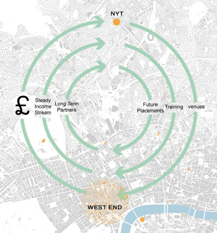 This increased capacity allows an expansion of the existing symbiotic relationship that the NYT has with the West End that was identified as a crucial network during the development of DSDHA’s initial feasibility study. The NYT allows West End productions to rent space for rehearsals and in return uses their theatres for performances.
