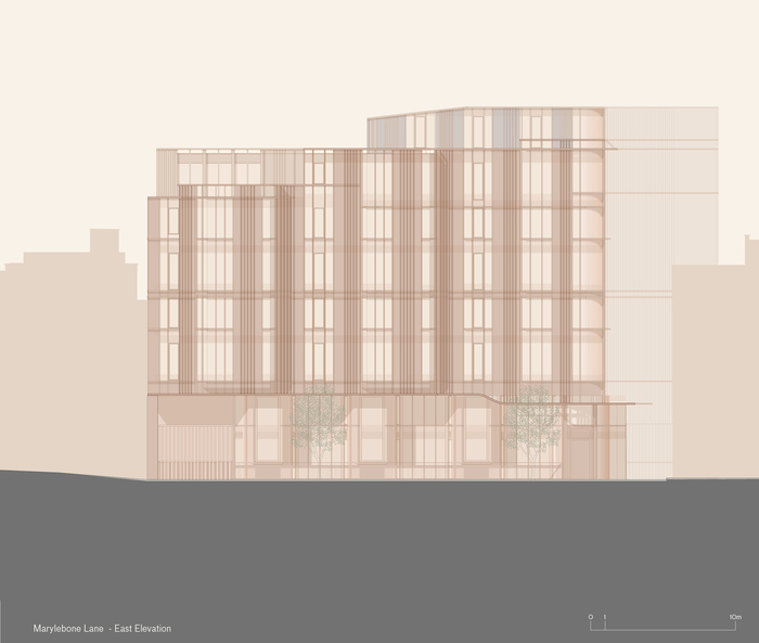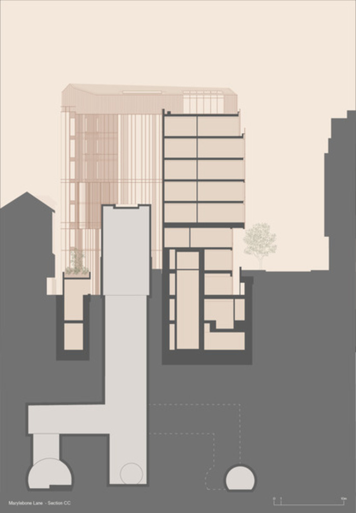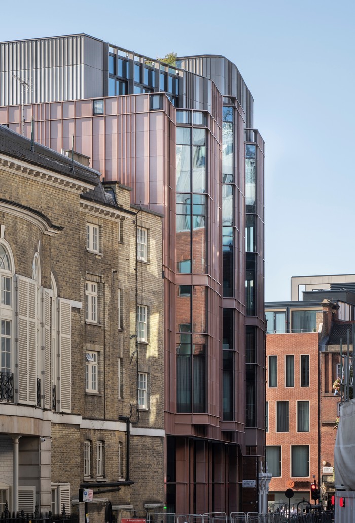 The intricate geometry of The Mansion at Marylebone Lane negotiates an array of complex site constraints. Situated in a transitional area between the lively Oxford Street and Mayfair to the south and the village-like atmosphere of Marylebone to the north, it sits alongside a Conservation Area and is visible behind the roofline of the Grade I-listed Stratford House. In addition, the new building sits just above the London Underground Jubilee Line.