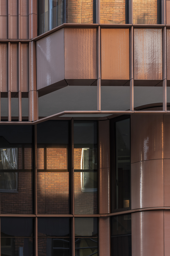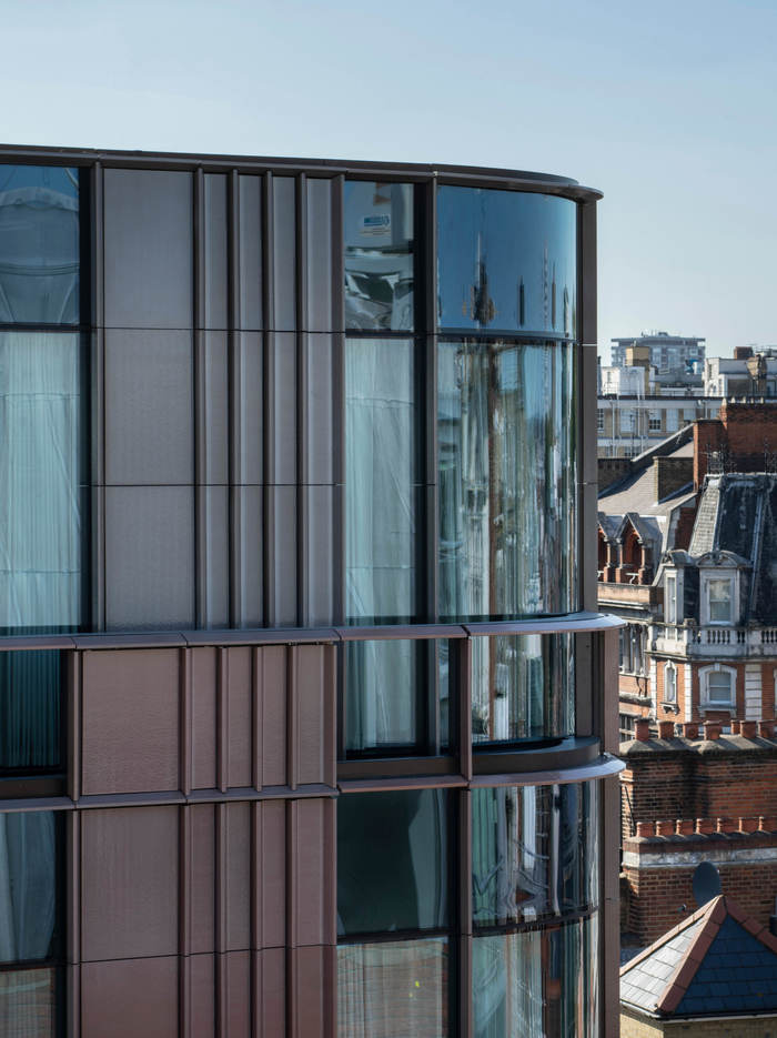The rear of the building features a paler shade of glazed terracotta, referencing the white-glazed brick courtyards of Victorian London. The cladding on the top two floors become muted and neutral with a less reflective surface in order to maintain the calm and quiet backdrop to nearby Stratford House.