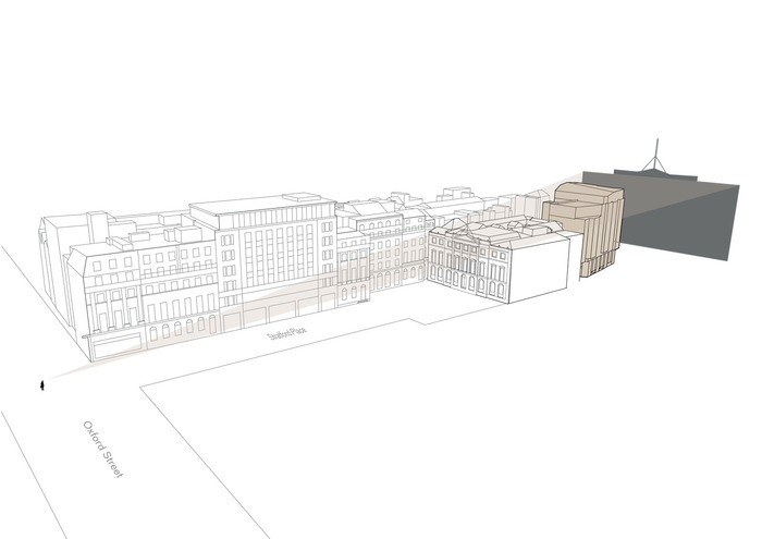 A critical consideration for the site’s development was its presence in the view of Grade I-listed Stratford House from the junction of Oxford Street and Stratford Place, identified as a significant contribution to Westminster’s townscape and historic character by the Westminster City Council Conservation Area Audit. The previous building had a negative impact on this view.