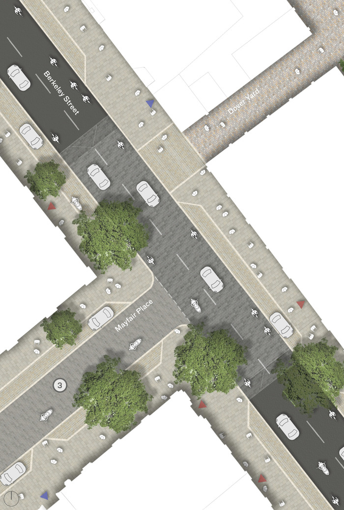 The Green Park & Piccadilly Gateway scheme reinstates the historic green connection between Berkeley Square and Green Park, connecting people to nature as well as creating safe and convenient access to the wider area. Beyond the gateway, the proposals contribute to existing greening initiatives in the area, such as the proposed Mayfair Green Route and ‘Wild West End’, as well as the Mayor of London’s Transport Strategy objectives, specifically Healthy Streets and Vision Zero.