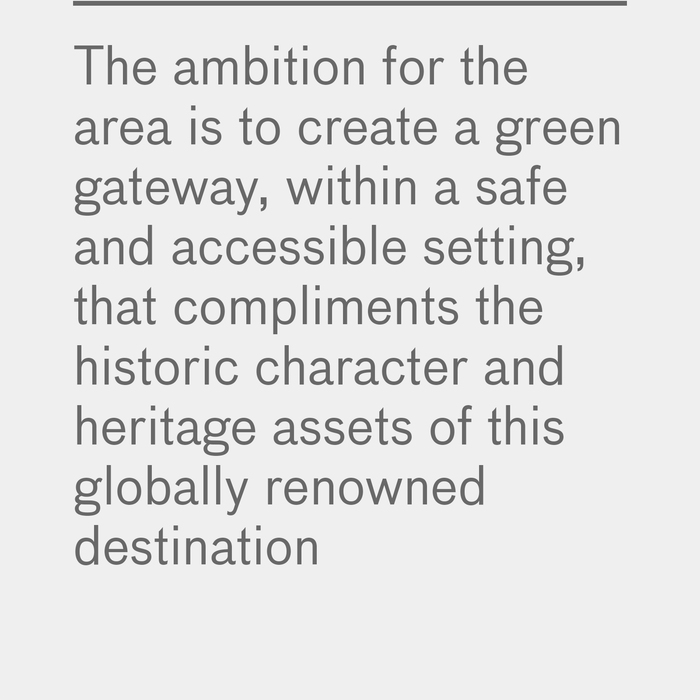 The Public Realm Vision Framework encapsulates the overall project aims and ambitions; creating a green gateway, within a safe and accessible setting, that compliments the historic character and heritage assets and is befitting of a globally renowned destination.
