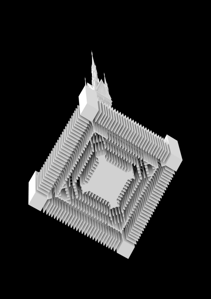Through the use of digital modelling and fabrication techniques, DSDHA’s has manipulated the model of the Memorial to reveal the hidden complex of brick vaults and arches that have dutifully supported the golden statue of Prince Albert since it was ceremonially seated in 1875. By allowing multiple viewpoints to converge, this distortion to the Memorial’s form hints at the ability of digital technologies to enhance our experience of the city, allowing access (either physical, virtual or both) to forgotten, inaccessible and underused spaces, which could be adapted to accommodate cultural uses, including much needed rehearsal space and artists’ studios in the city.