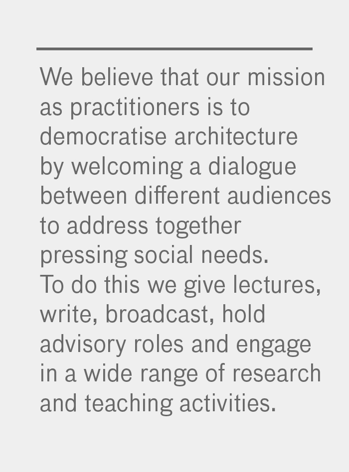 We design, teach and foster talent, write and share our thoughts about architecture with the wider public as well as the profession. Our intention is to open up the world of architecture and invite people in, to explore and learn about the role of spatial design in our lives.
