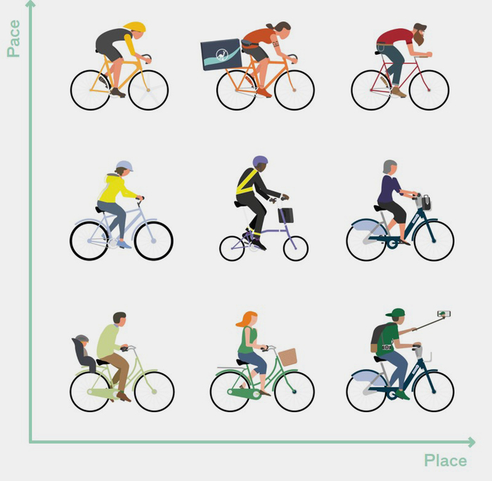Drawing inspiration from the experiments of Smithson, Venturi/Scott-Brown and Appleyard/Lynch/Myer, we sought to shift the perspective on transport and public realm planning from a problem of engineering and efficiency to one of architecture, human health, safety and beauty. We conducted extensive research on the ground, on foot and on our bikes; as well as using geotagged technology to map people’s journeys. We then created a taxonomy of cyclists in London.Our point of departure was Transport for London famous road matrix, which classifies roads according to the prominence of their setting and speed on the vertical axis. We substituted these roads with the cyclist who are more likely to travel on them. This was meant as a bit of a provocation since, our analysis of current guidance highlighted that, despite the declared intention on the part of the Mayor to create a ‘more inclusive transport strategy’, encouraging a more diverse group of people to cycle and walk, the reality was that in these documents cyclists and pedestrians were always described as an homogenous group. It is no surprise then that in London most road types are dominated by the lycra-clad.We wanted to define cyclists's characters and attitudes, understand what they valued and what they feared when they travel. Particularly as different speeds of motion allow very different social and aesthetic experiences of the environment. For instance lycra-clad travelling at 20miles per hr from A-B, enjoys speed and is not too disturbed by the presence of fast vehicles, his field of vision is narrower and therefore less aware of the setting, his social interactions mostly happen though digital app such as Strava, where he records and shares his journeys with other lycra-clads. On the contrary a tourist on a boris-bike, travels at 8 miles/h, in groups, she is much more aware of the setting, frequently stopping to take pictures or talk to her companions.Our Methodology