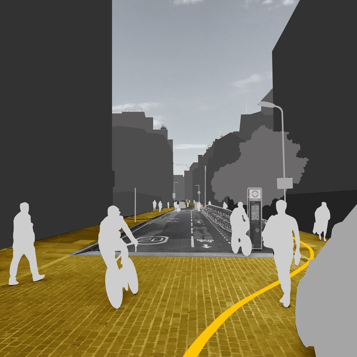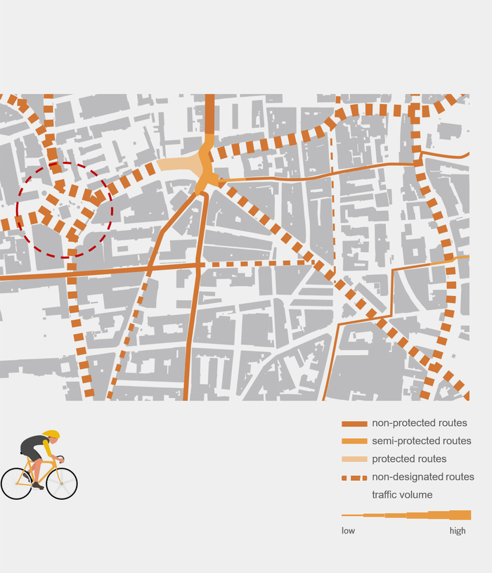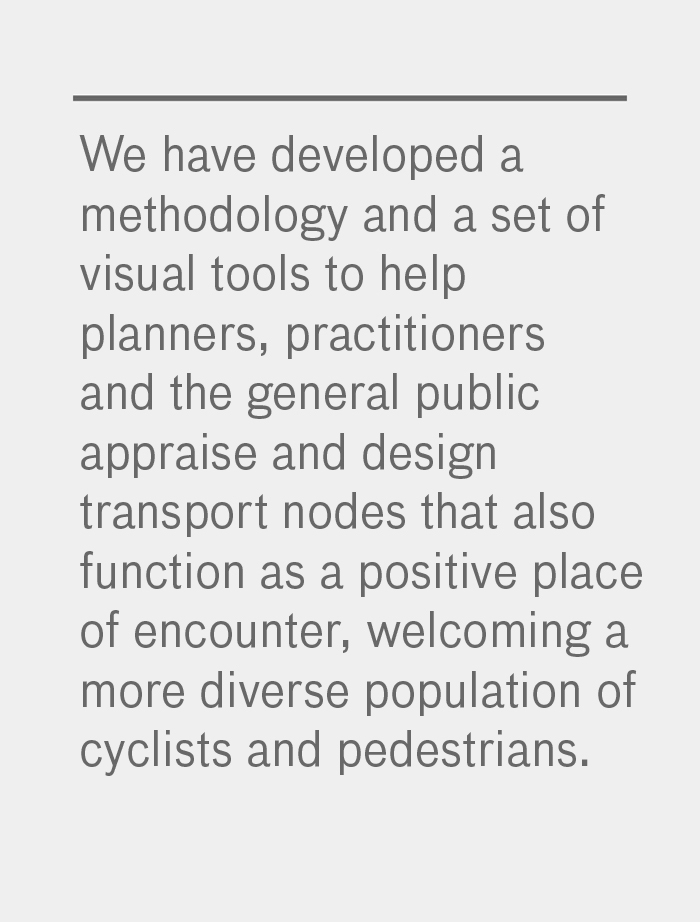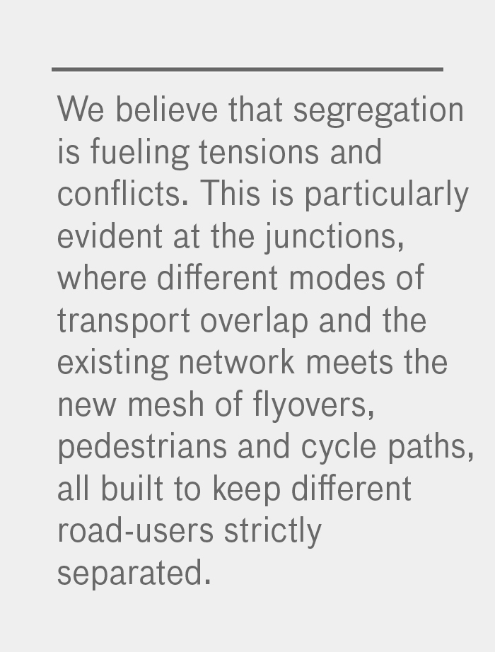 More recently new road-users have started to compete for their space in the city. Cyclists, in particular, have dramatically changed the experience of moving through London, with bicycles now being the fastest means of transport within the inner city. However, beyond its documented logistical, health, environmental and social benefits, cycling is also causing huge conflict on our roads.This is partly because, in integrating cyclists and pedestrians, the attempt has largely been to replicate 20th century planning models, scarring our city with a mesh of flyovers, segregated pedestrians and cycle paths, to keep different road-users separated as much as possible and with little consideration given to the psychological and human experience of moving across the city.This model – we believe – is fuelling tensions and ruining the urban setting. Moreover, due to its lack of flexibility, all this expensive infrastructure is at risks of becoming obsolete with the introduction of autonomous vehicles, which, without a doubt, will force us to question a lot of assumptions on urban mobility.The Issue of ScaleIt is important to remember that London, is not like Amsterdam and Copenhagen – cities with a more ordered, coherent and compact layout. The sheer scale of the UK Capital inevitably results in longer commutes: real ‘journeys’ taking one through different urban conditions across the city’s 32 boroughs, plus the City of London, each with its own political and administrative identity and with a street pattern that changes moment by moment, straight to winding, leafy to truck-thronged, wide to narrow.In many ways London’s network appears as the reversal of Dutch planning principles. Dutch cities tend to have extensive areas of Shared Space at their core: with motorists, pedestrians and cyclists acting as one and proceeding at moderated speed within the historic centre. Segregated routes, either Motorways or Cycle Superhighways constitute the ‘exception’. They connect one historic city centre (essentially a macro Shared Space) to the other and to transport infrastructures such as airports and train stations, allowing road users to move between them at greater speed.By contrast, the Cycle Superhighways and Quietways of the Central London Grid cut through the historic core; the first segregating cyclists from motorised traffic, and the latter excluding them from most of pedestrianised areas in and around London’s cultural infrastructure: i.e. its major monuments, landmarks and attractions.A More Inclusive Urban EnvironmentIn this complex road network, the issue of conflict between different road users becomes most evident at the junctions. Take for instance Blackfriars Bridge, where Quiteways, multiple Cycle Superhighways’ segregated routes converge and meet with highways as well as with hordes of pedestrians flocking out of the underground and railway stations.At this highly engineered segregated junction a substantial amount of road signs, traffic signals, roundabouts, crossing points and kerbs regulate the flow and dictate the pace of different transport modes whilst keeping them strictly separated. This is hardly a place of positive encounter, with tension and stress level typically very high and any sense awareness of the setting diminished. This type of junction is typically the territory of one type of cyclist: the lycra-clad who favours speed over the appreciation of his (it is usually a 'he') surroundings and shows a braver and more aggressive attitude.Non-segregated junctions – such as Leonard Circus – represent an alternative. Here the Quietways typically converge with other networks and a more diverse population of cyclists (not just the lycra-clad) negotiate their space and pace with either pedestrians or motorists. We have concentrated our study specifically on these typologies of ‘shared space’, which we believe are key to create more inclusive public spaces. Yet at the moment they are but ‘islands’ within the Central London Grid and, in part because of their sparse nature, are perceived as interruptions to the network of designated cycling and transport routes and, precisely for this, are criticised by users and stakeholders.A Perspectival Shift
