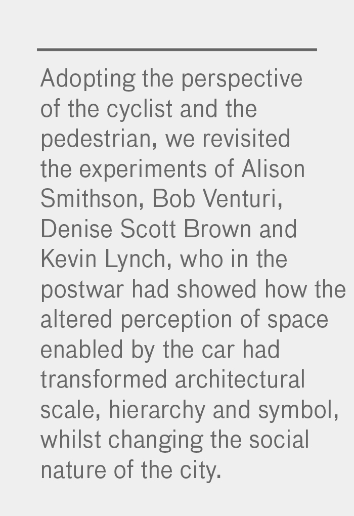 The second step is to map the uses within each building in proximity of the site – understanding where shops, bars, restaurants, theatres, offices, parks, etc., are located and how their associated activities and operating hours affect the flow of people and goods at different times of the day or of the year. These activities are recorded at ‘peak’ and ‘off-peak’, throughout the day/night – using observation on the ground or CCTV cameras where possible. Sometimes these activities cause large stationary crowds to gather in front on their premises, like people queuing up in front of the food stalls at lunchtime for instance, and this sensibly reduces the available space for movement.3_BehaviourThe final step is to map the stress levels of different users approaching the site. A cyclists coming from a busy road, where she had to compete for space with cars and vans, would be considerably more stressed, and typically more aggressive, than another cyclist entering the junction from a segregated route or a pedestrian coming from an alleyway. It is often this disparity of mind-sets that causes conflict at a junction, as such we seek to design a ‘buffer zone’ in and around the junction that either stresses or ‘decompresses’ the users, helping them to reach the same mind set/speed at a junction, so that the negotiations of space required can take place without the aid of too much signage or road infrastructure.To create these ‘buffers’ we consider the effect of different surfaces on the users’ behaviour: a cobbled path for instance slows down bikes, but doesn’t affect pedestrians as much. Moreover by documenting an unfolding sequence of views for different characters, we determine the ‘imageability’ of a public space I.e. how clearly the space is perceived and what reactions this causes in its users.Furniture and planting are also elements that can affect the legibility of a space and affect the confidence (and therefore the speed) of different users groups. The same can be said of the presence of other people and vehicles: a variable that is not usually taken into consideration when designing urban schemes, but can shift hugely throughout a day, impacting both mobility and the character of a site.Images: Robert Venturi, Denise Scott Brown & Steven Izenour, Learning from Las Vegas; Alison Smithson, AS in DS: An Eye on the RoadTeam: Deborah Saunt Tom GreenallShare: