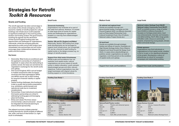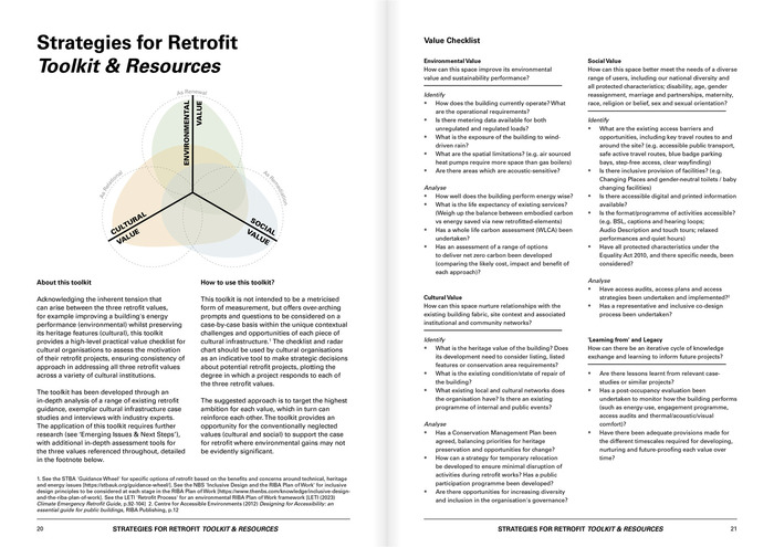 'Retrofitting for Cultural Infrastructure' has been developed through agile engagement with built environment specialists and representatives from HM Government to address both past and emerging challenges associated with retrofit strategies for cultural use. These issues range from broader challenges, such as addressing funding inaccessibility and VAT incentivisation, to more specific intersectional issues, such as establishing regulations on embodied carbon emissions and investing in promoting and disseminating a holistic approach at a local level.